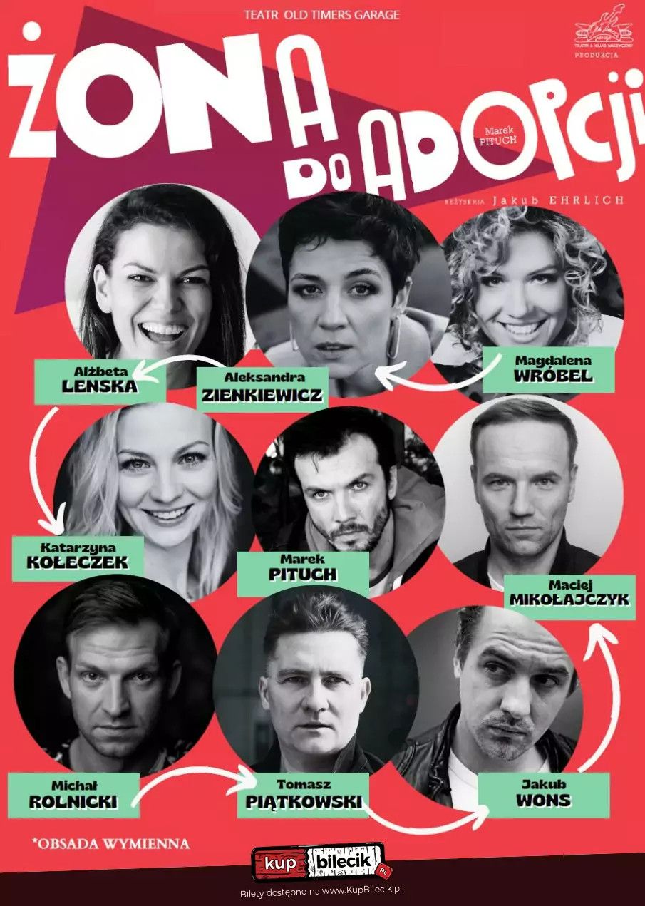 | Żona do adopcji - spektakl komediowydodano 2025-06-23 11:14:17 W życiu Adama wszystko miało swoje miejsce - dom praca, dom praca. Od czasu do czasu jakaś kontrolowana rozrywka. Ale w życiu każdego człowieka przychodzi taka chwila, że nawet dobrze naoliwiona maszyna przestaje funkcjonować i niebo zaczyna walić się na głowę. Żona Adama wyjeżdża. Mieszkanie nawiedza natrętny domokrążca i wróżbita. Niespodziewanie pojawia się również Filip, kolega z podstawówki. Do drzwi puka przedstawicielka Ośrodka Adopcyjnego, o której wizycie Adam zupełnie zapomniał. Spokojne dotychczas życie bohatera wypełnia się mnóstwem niedomówień, pomówień i abstrakcyjnych insynuacji. A wszystko przykryte płaszczem "normalności". Jak rozwiąże się splot dziwnych wydarzeń? Żona do adopcji artyści: Alżbieta Lenska, Magdalena Wróbel, Katarzyna Kołeczek, Aleksandra Zienkiewicz, Marek PituchW życiu Adama wszystko miało swoje miejsce – dom praca, dom praca. Od czasu do czasu jakaś kontrolowana rozrywka. Ale w życiu każdego człowieka przychodzi taka chwila, że nawet dobrze naoliwiona maszyna przestaje funkcjonować i niebo zaczyna walić się na głowę. Żona Adama wyjeżdża. Mieszkanie nawiedza natrętny domokrążca i wróżbita. Niespodziewanie pojawia się również Filip, kolega z podstawówki. Do drzwi puka przedstawicielka Ośrodka Adopcyjnego, o której wizycie Adam zupełnie zapomniał. Spokojne dotychczas życie bohatera wypełnia się mnóstwem niedomówień, pomówień i abstrakcyjnych insynuacji. A wszystko przykryte płaszczem „normalności”. Jak rozwiąże się splot dziwnych wydarzeń Bilety do nabycia na: KupBilecik.pl |